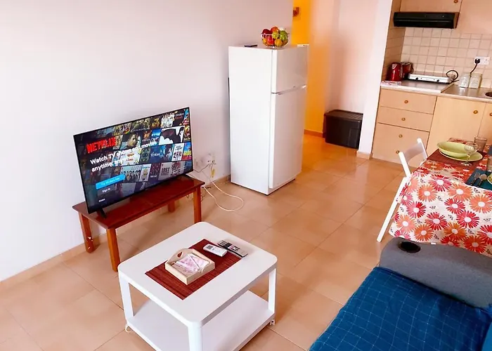 Obiekt posiada pełnowymiarową kuchnię z czajnikami elektrycznymi, lodówką i szklanymi naczyniami. Najbliższa restauracja to Dionyssos Fish Tavern, która znajduje się zaledwie o krok od obiektu i serwuje potrawy kuchni śródziemnomorskiej. Ten apartament leży 10 minut jazdy samochodem od lotniska Larnaka.